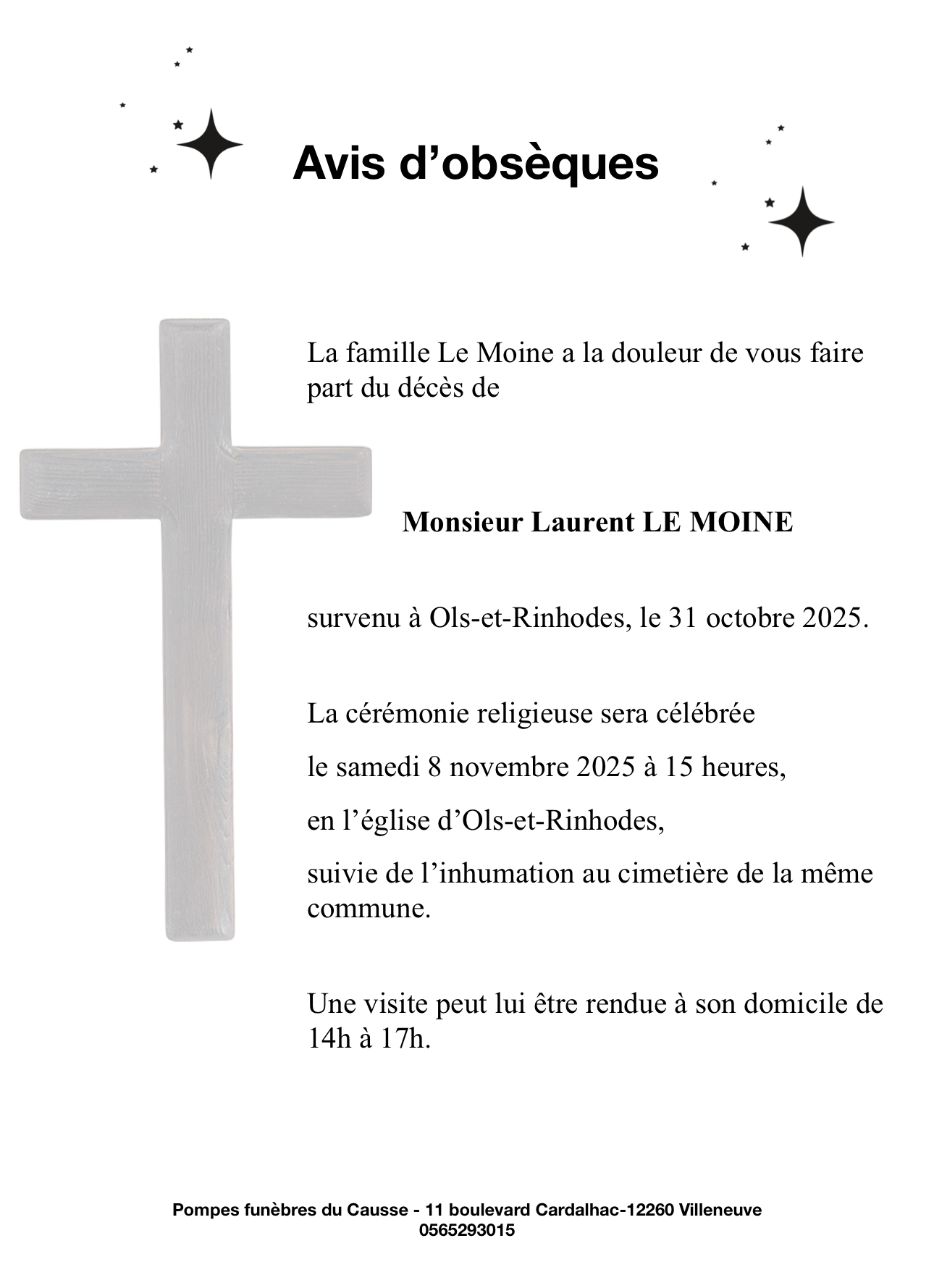 C’est avec une grande tristesse que nous vous annonçons le décès de Laurent LE MOINE survenu le vendredi 31 octobre 2025 à Ols-et-Rinhodes. La cérémonie se déroulera le samedi 08 novembre 2025 à 15h00 à l’adresse suivante : Église - 12260 Ols-et-Rinhodes.